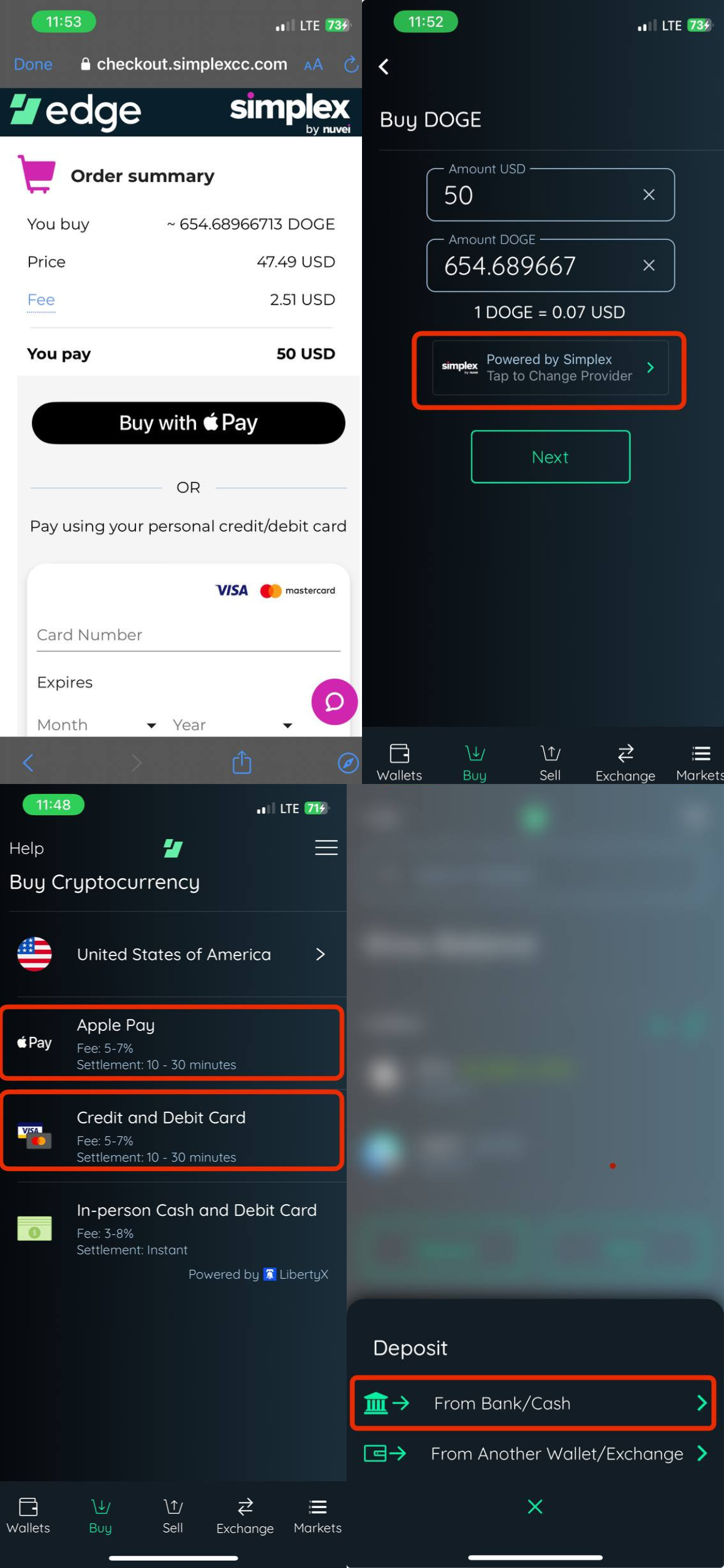 The Edge app will guide you through the process of purchasing Dogecoin using your credit card via Simplex. Follow the instructions provided, and make sure to input the necessary information.